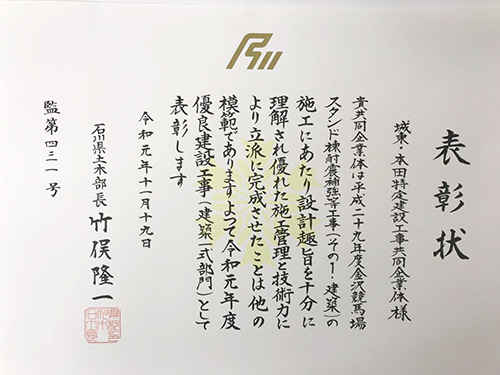 この度、金沢競馬場スタンド棟耐震補強等工事(その1・建築)におきまして、土木部優良建設工事の部長表彰を授与しました。